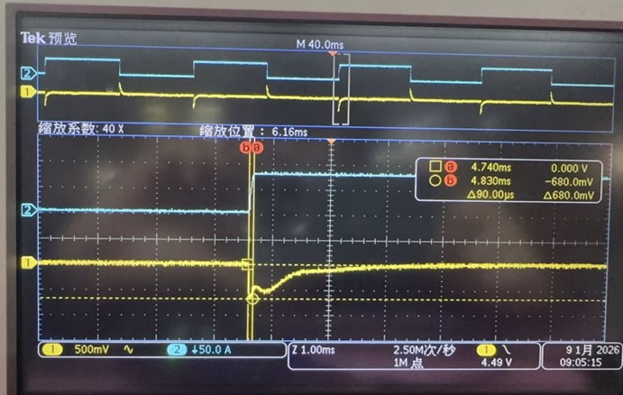 As shown in Figure 1, when the motor inrush current reaches 10 A, the power supply voltage temporarily drops to 7.3 V. Since the device’s undervoltage protection threshold is 7.5 V, this voltage dip triggers the protection mechanism, resulting in system shutdown.