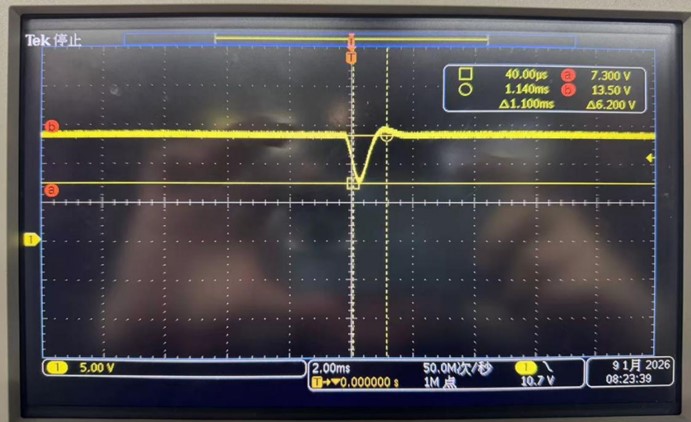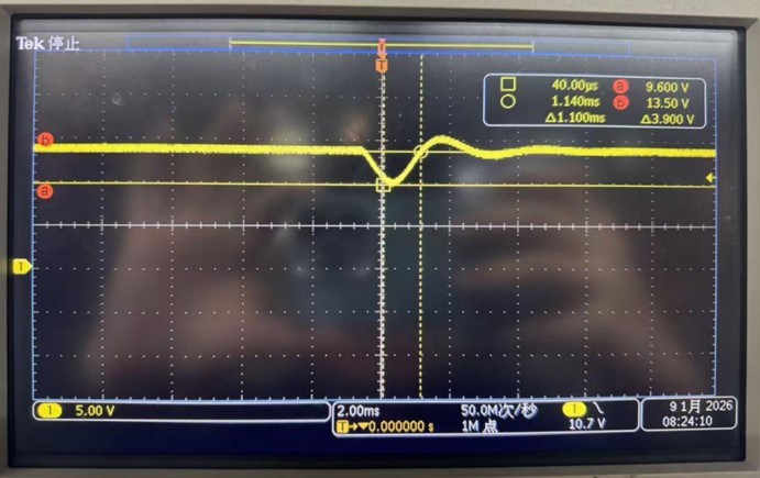 As shown in Figure 1, when the motor inrush current reaches 10 A, the power supply voltage temporarily drops to 7.3 V. Since the device’s undervoltage protection threshold is 7.5 V, this voltage dip triggers the protection mechanism, resulting in system shutdown.