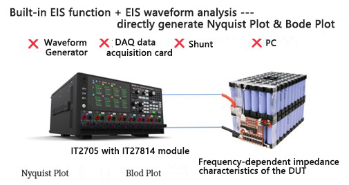 The ITECH IT2705 mainframe, when equipped with the multi-channel SMU module IT27814, features a built-in EIS testing function that automatically generates Nyquist and Bode plots. By capturing subtle responses under multi-frequency excitation (0.01 Hz to 20 kHz), it reveals potential issues that are difficult to detect with conventional methods. The results, visualized through Bode and Nyquist plots, are particularly valuable in processes such as second-life utilization and remanufacturing of power batteries—for example, in incoming material pre-screening, standard scans, module matching, and final acceptance testing.