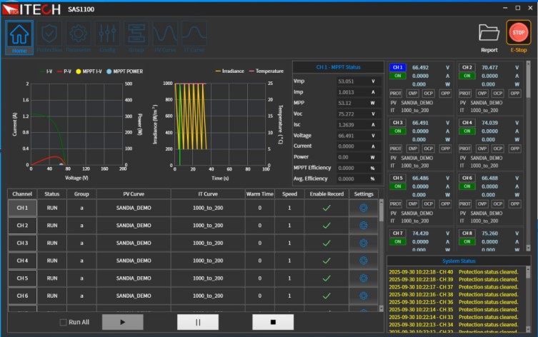 The SAS1000 series, ITECH’s early 1–20 channel array simulator software (SAS1000: single-channel / SAS1000M: 20-channel), has been well recognized in the market over the past 8 years. Its mature and comprehensive features include support for complex operating conditions such as dynamic cloud shading, built-in regulatory reports for various countries, batch data recording/export, template-based condition management, and one-click retesting. It is compatible with solar array simulators like IT6600, IT6000, IT-M3900, and IT-N2100, and is widely used for inverter/microinverter validation, production line spot checks, and aging tests. This solid software and application foundation paves the way for the multi-hundred-channel upgrade in the SAS1100.